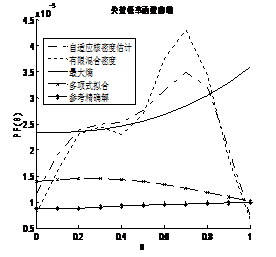 算例8.28.3所示的Y型節(jié)點管,剖面AA的載荷為軸向力,面內(nèi)彎矩,截面彎矩,極限狀態(tài)方程為。其中為互不相關(guān)的正態(tài)分布隨機變量,其分布參數(shù)見81。的分布取為均值為2×103、標(biāo)準(zhǔn)差為0.5×103的正態(tài)分布。本例運用Monte Carlo抽樣105的樣本點,得到760個失效樣本來估計條件密度函數(shù)。以下給出四種擬合方法所得到的失效概率函數(shù)和全局靈敏度的曲線圖。