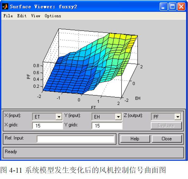 從仿真曲面圖中可以清楚的看到,當(dāng)系統(tǒng)模型發(fā)生變化時,風(fēng)機的控制策略也隨著發(fā)生變化,體現(xiàn)了系統(tǒng)的智能性和自適應(yīng)性。