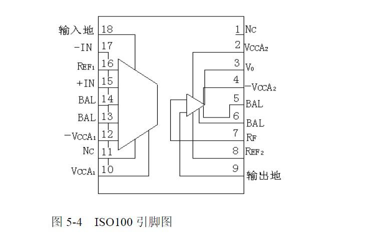 由于環(huán)境試驗(yàn)箱的工作環(huán)境十分惡劣,因此輸入通道的各個(gè)環(huán)節(jié)中存在各種電磁干擾以及共模干擾等不良因素,會(huì)造成測(cè)量信號(hào)嚴(yán)重失真,系統(tǒng)不穩(wěn)定等后果。特別是存在強(qiáng)電干擾時(shí)會(huì)直接影響系統(tǒng)的安全。為此,在輸入通道中常常采用信號(hào)隔離措施。常用的方法是采用隔離放大器。這是因?yàn)楦綦x放大器的線性和穩(wěn)定性好,隔離電壓和共模抑制比高,應(yīng)用電路簡(jiǎn)單,頻帶較寬等。本設(shè)計(jì)中采用了ISO100光耦合隔離放大器保證前向通道的信號(hào)傳輸質(zhì)量ISO100 是一種小型廉價(jià)的光耦合隔離放大器。其工作電源為±18V,隔離電壓2500V,輸入電流為±1mA,頻帶寬達(dá)60kHz,為18 引腳DIP 組件。引腳圖如圖5-4 所示: